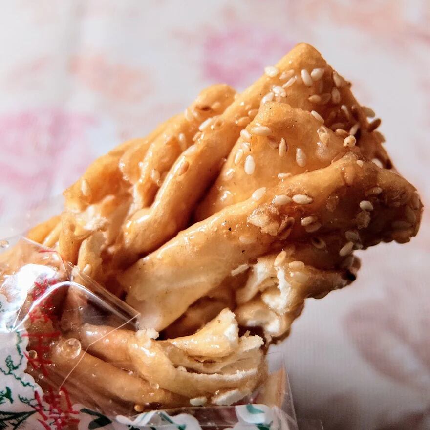 麻花捲(台湾風かりんとう)に麦芽糖の密をたっぷり絡めて、かりんとうのようにサクサクではなく柔らかくてしっとりとした食感。食べるとかりんとうのように素朴な小麦の風味が感じられて美味しい。