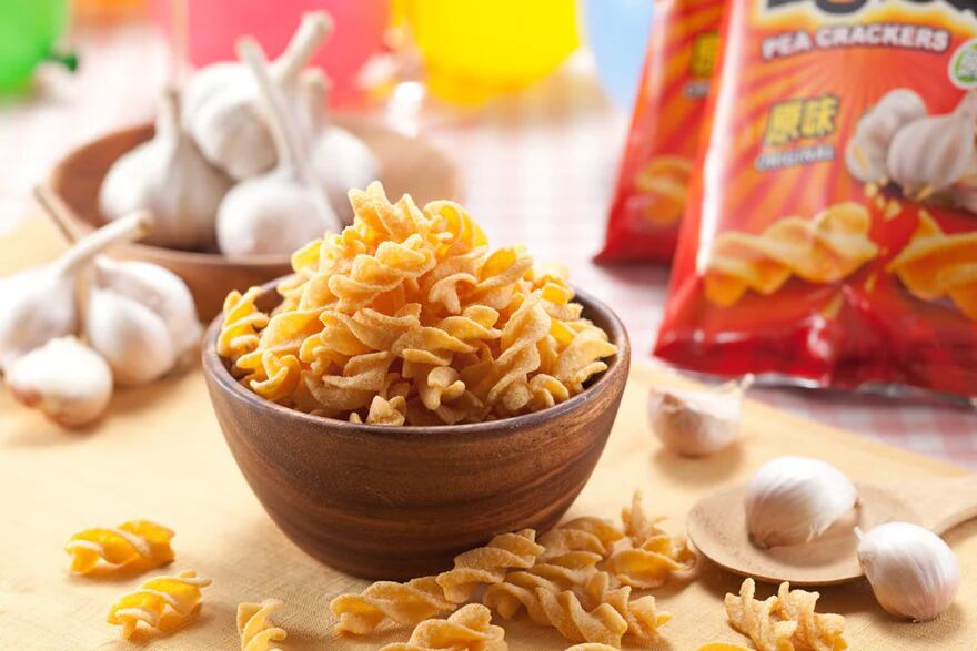 【原材料名】スナック本体(エンドウ、コーンスターチ、小麦粉、タピオカ澱粉、膨張剤、乳化剤)、パーム油、塩、砂糖、マルトデキストリン、ガーリックパウダー、複合香料(アラビアガム、ガーリックエキス、二酸化ケイ素)、二酸化ケイ素、調味料(アミノ酸、核酸等)