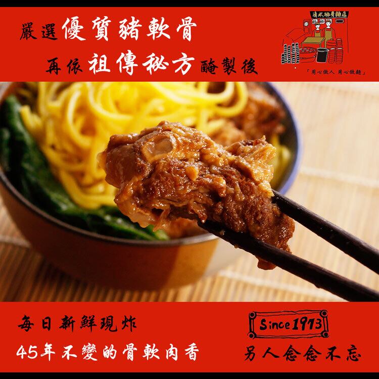豐原清水排骨酥麵は、1973年創立、現在は三代目のお店で、本店は台中の豐原慈濟宮の周りにある「豐原廟東夜市」の名物グルメ。弱火でゆっくりと蒸した厳選した軟骨を、秘伝のタレに漬け込み、毎日油で揚げる初代から同じ方法で作られている排骨酥(豚軟骨唐揚げ)を甘めの味付けでスープと麺と絡ませていただくパーコー麺。