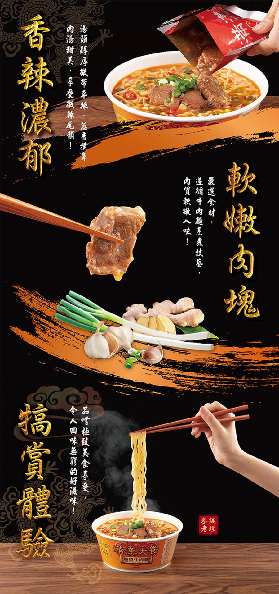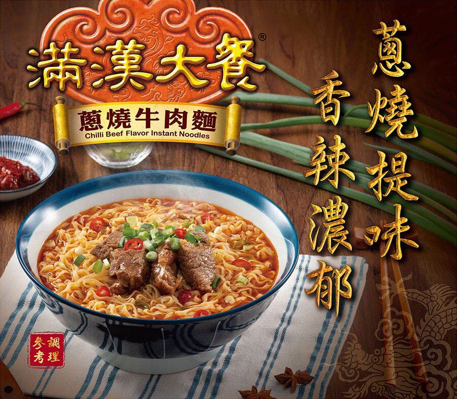 満漢大餐は台湾で30年以上に渡り、多くの人々から親しまれてきました。その味は台湾の代表的なおもてなしの味としても知られています。滿漢大餐が他のインスタントラーメンと一線を画す理由は、麺のメインであるゴロッとした肉が楽しめること。真空パックに肉と旨味を含むラーメンの全てが詰め込まれています。