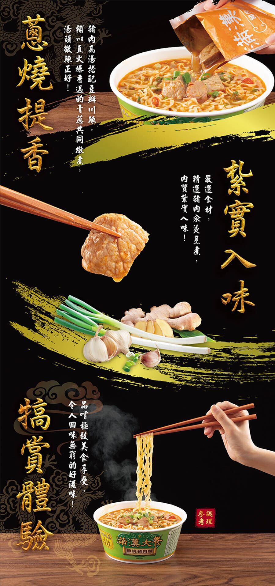 満漢大餐は台湾で30年以上に渡り、多くの人々から親しまれてきました。その味は台湾の代表的なおもてなしの味としても知られています。滿漢大餐が他のインスタントラーメンと一線を画す理由は、麺のメインであるゴロッとした肉が楽しめること。真空パックに肉と旨味を含むラーメンの全てが詰め込まれています。