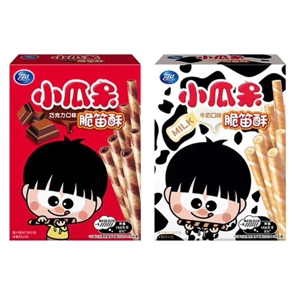台湾のロングセラー菓子「小瓜呆脆笛酥(お坊ちゃんウエハースロール)」。「小瓜呆」はパッケージのイラストの子の名前で「お坊ちゃん」という意味です。