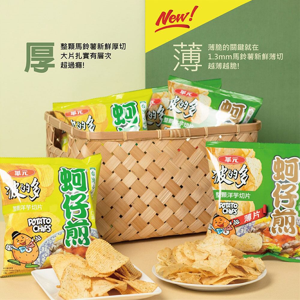 台湾屋台で人気の定番メニュー「蚵仔煎(オアジェン)」風味のポテトチップスです。蚵仔煎(オアジェン)とは、日本では牡蠣オムレツとして知られ、牡蠣を卵とモチモチ生地で挟んで焼き、甘じょっぱいソースで食べる料理です。ギザギザのウェーブカットのザクザク食感と風味をお楽しみください。