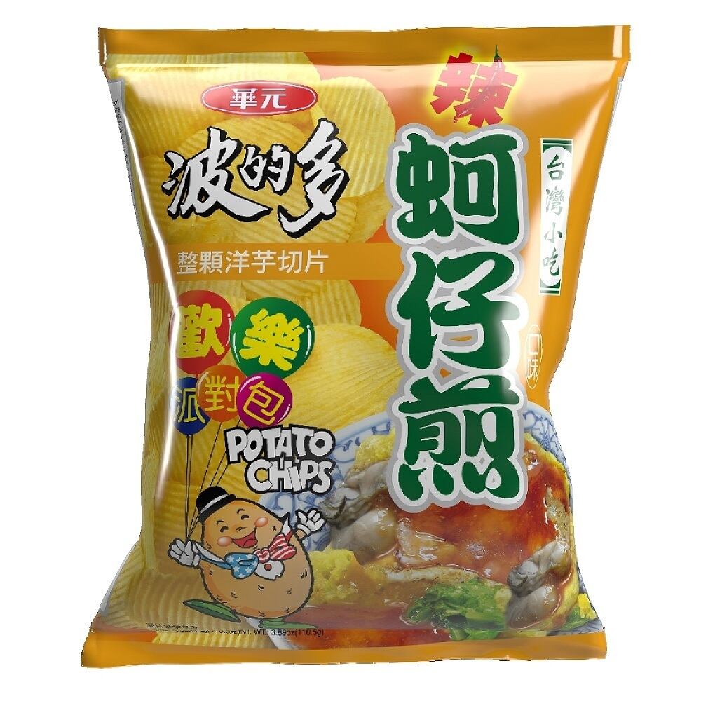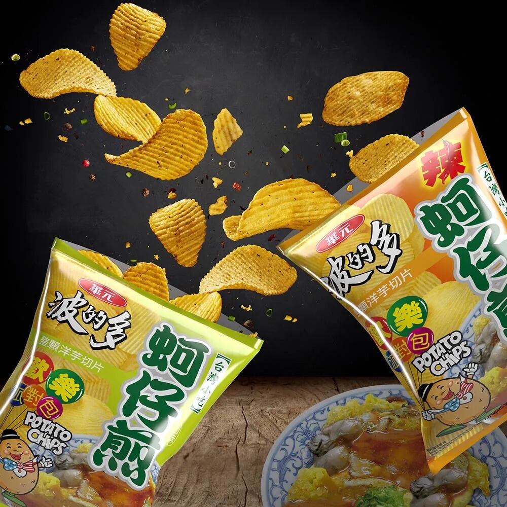 台湾屋台で人気の定番メニュー「蚵仔煎(オアジェン)」風味のポテトチップスです。蚵仔煎(オアジェン)とは、日本では牡蠣オムレツとして知られ、牡蠣を卵とモチモチ生地で挟んで焼き、甘じょっぱいソースで食べる料理です。ギザギザのウェーブカットのザクザク食感と風味をお楽しみください。